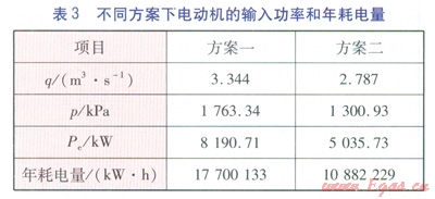 電動(dòng)機(jī)軸功率乘以年最大熱負(fù)荷利用時(shí)間即為估算的年耗電量(見(jiàn)表3)。由此可見(jiàn),方案一要比方案二每年多消耗電能6817904kW·h,按照平均電價(jià)為0.9元/(kW·h)計(jì)算,兩個(gè)方案的電費(fèi)差額為613.61×104元/a。