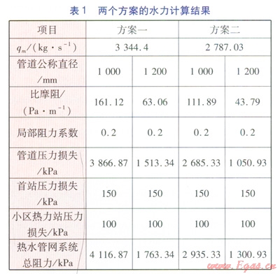 方案二中,Dt=60℃,由公式(1)可得,設(shè)計(jì)質(zhì)量流量為2787.03kg/s,查水力計(jì)算表可得,取管道公稱直徑為1000mm時(shí),管道比摩阻為111.89Pa/m,熱水管網(wǎng)系統(tǒng)總阻力為2935.33kPa,加上定壓壓力后,在沒(méi)有中繼泵站的情況下,系統(tǒng)最高壓力為3185.33kPa,大幅超過(guò)了系統(tǒng)的設(shè)計(jì)壓力,顯然是不合理的;取管道公稱直徑1200mm時(shí),比摩阻為43.79Pa/m,熱水管網(wǎng)系統(tǒng)總阻力為1300.93kPa,加上定壓壓力后,在沒(méi)有中繼泵站的情況下,系統(tǒng)最高壓力為1550.93kPa,無(wú)須設(shè)置中繼泵站即可將管道的壓力控制在設(shè)計(jì)壓力范圍之內(nèi)。