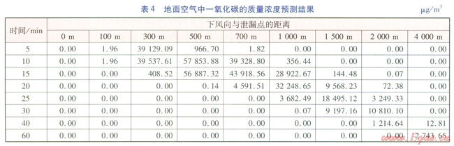 泄漏條件:一氧化碳的泄漏質(zhì)量流量為0.76kgs,泄漏持續(xù)時間為10min,泄漏點(diǎn)高度為3m,每10s釋放一個煙團(tuán)。氣象條件:風(fēng)速為1.8ms,大氣穩(wěn)定度為D級。采用多煙團(tuán)模式預(yù)測方式的預(yù)測結(jié)果見表4。根據(jù)預(yù)測結(jié)果,可分析不同時刻下風(fēng)向地面空氣中一氧化碳質(zhì)量濃度超標(biāo)距離范圍。