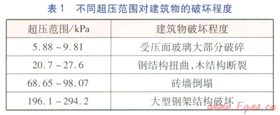由沖擊波一沖量準(zhǔn)則確定的不同超壓范圍對建筑物的破壞程度、人體的傷害程度分別見表1、2。