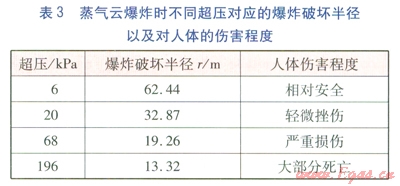 以建筑物破壞程度作為基準(zhǔn),超壓選取不同建筑物破壞程度對應(yīng)的超壓最小值(并進(jìn)行圓整),由式(1)(2)計算壓縮機(jī)房泄漏焦?fàn)t煤氣發(fā)生蒸氣云爆炸時,不同超壓對應(yīng)的爆炸破壞半徑,并判定對人體傷害程度,見表3。