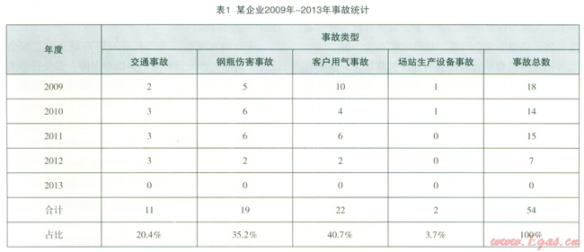 搞好安全管理的前提是進(jìn)行風(fēng)險(xiǎn)分析。根據(jù)企業(yè)的具體特點(diǎn),對(duì)全企業(yè)進(jìn)行全面而系統(tǒng)的安全風(fēng)險(xiǎn)分析,按照現(xiàn)代系統(tǒng)安全工程的觀點(diǎn),安全生產(chǎn)工作是為了使生產(chǎn)過(guò)程符合物質(zhì)條件和工作秩序,防止發(fā)生人身傷亡和財(cái)產(chǎn)損失的活動(dòng),安全牛產(chǎn)工作的主要目標(biāo)是使系統(tǒng)中的人員免遭不可承受風(fēng)險(xiǎn)的傷害。安全管理工作實(shí)際上就是風(fēng)險(xiǎn)管理工作。各崗位的危險(xiǎn)程度用危險(xiǎn)度來(lái)表示,它是由事故發(fā)生的可能性和事故后果的嚴(yán)重性決定的。經(jīng)過(guò)對(duì)國(guó)有瓶裝氣企業(yè)進(jìn)行安全風(fēng)險(xiǎn)陛分析,我們得出最常見(jiàn)的安全風(fēng)險(xiǎn)主要有交通安全風(fēng)險(xiǎn)、鋼瓶傷害風(fēng)險(xiǎn)、場(chǎng)站安全風(fēng)險(xiǎn)、客戶(hù)用氣事故風(fēng)險(xiǎn)等等,這與國(guó)有瓶裝氣企業(yè)歷年安全事故統(tǒng)計(jì)相吻合,某企業(yè)2009年~2013年事故統(tǒng)計(jì)見(jiàn)表1。