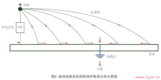 從防腐層破損點的角度上看,接地點的位置相當于一個較大的破損點。對于正常的帶有防腐層的管道,一般在陰極保護設計和運行維護過程中,認為防腐層破損點的面積只占防腐層總面積的1%-10%左右,而在出現(xiàn)接地點后,特別是由于接地極或接地網引起的接地短路(接地電阻在幾個歐姆或者零點幾個歐姆),在陰極保護的電流需求計算時,折合成破損點的面積時甚至可能會占到總面積的50%以上,在這種情況下可能會使接地點附近幾公里的管線得不到有效保護。