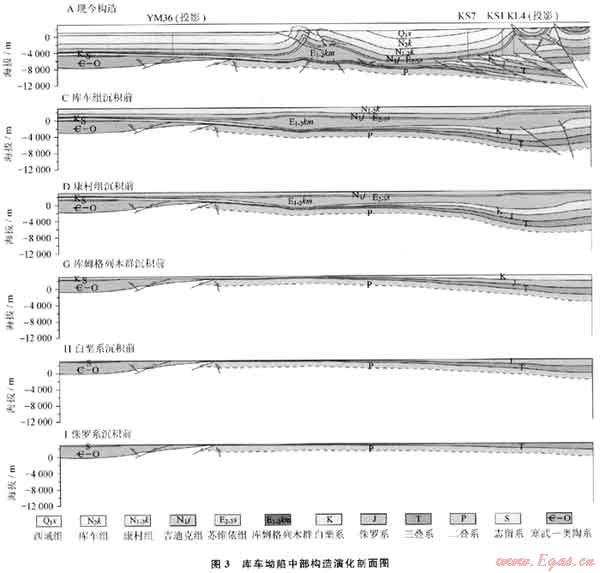 整個(gè)庫車坳陷處于相對穩(wěn)定的沉積時(shí)期。庫姆格列木群是在穩(wěn)定或弱伸展環(huán)境中沉積的,在克拉蘇沖斷帶與秋里塔格沖斷帶沉積了巨厚的膏鹽巖層;蘇維依組沉積厚度穩(wěn)定;吉迪克組有微弱的構(gòu)造活動(dòng)。推測吉迪克組沉積時(shí)期可能發(fā)生輕微的底辟活動(dòng),但構(gòu)造變形不明顯,斷裂也不發(fā)育。