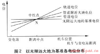 鋼軌泄漏電流的大小、管道中雜散電流的大小及方向,可通過鋼軌、大地、管道各自的電位進行分析。以無限遠大地作為基準,鋼軌和管道電位分布見圖2。機車所在位置為鋼軌電位正最大值,變電站附近為鋼軌電位負最大值,鋼軌電位分布影響到大地電位和管道電位分布[5~7]。鋼軌正電位處電流離開軌道進入土壤或埋地管道,在靠近變電站位置軌道對地負電位處,電流從埋地金屬管道流出進入土壤,通過大地返回負極,引起管道的腐蝕破壞。