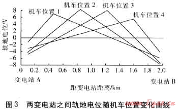 雜散電流的變化與雜散電流源的變化具有一致性,軌交雜散電流的大小隨軌交系統(tǒng)的用途、機車的相對位置和運行狀態(tài)不同而變化。機車在每兩個站臺之間都要經(jīng)歷加速、勻速、減速的過程,不同運行狀態(tài)下機車電流不同。隨機車電流及機車位置的變化,軌道電流和軌道對地電位(簡稱軌地電位)也處于變化中,圖3為兩變電站之間軌地電位隨機車位置變化曲線。軌地電位為正時,雜散電流流入大地,軌地電位為負時,雜散電流返回鋼軌。鋼軌泄漏電流位置的變化使得埋地管道對地電位(簡稱管地電位)處于不斷變化之中,管道發(fā)生雜散電流腐蝕的位置和強度也在不斷變化[8]。
