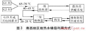 ① 港西地區(qū)新建建筑首選地?zé)崴帷D壳?,港西地區(qū)G1、G2、G19井待用,地?zé)崴捎锰菁壚梅绞?。港西地區(qū)地?zé)崴菁壚梅绞揭妶D3。采用溫度為65~70℃的G1、G2井地?zé)崴?jīng)一級換熱器加熱散熱器供暖系統(tǒng)供水,地?zé)崴疁囟冉抵?0~45℃。然后經(jīng)二級換熱器為熱泵提供熱量,熱泵制取熱水后供地板輻射供暖系統(tǒng)。尾水溫度為20~25℃,回灌到G19井或其他回灌井。