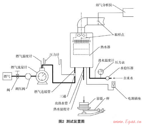 (1) 選定待測熱水器,進(jìn)行安裝,凋試。對于非恒溫機(jī),將燃?xì)忾y門開至最大,調(diào)節(jié)出水溫度比進(jìn)水溫度高40±1℃,當(dāng)不能調(diào)節(jié)至此溫度時,在熱水器溫度可調(diào)范圍內(nèi),淵節(jié)至最接近的溫度。對于恒溫機(jī),將溫度設(shè)定在最高狀態(tài),適當(dāng)提高進(jìn)水樂力,使熱水器在最大負(fù)荷狀態(tài)下工作;