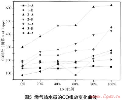 圖5為LNG比例對熱水器C0排放的影響。隨著LNG比例的增加,熱水器的C0值呈現(xiàn)增大趨勢。