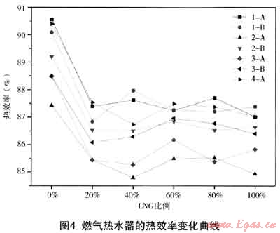 (3) 熱效率不是互換性指標(biāo)。但是除了3-A和3-B以外,幾乎所有熱水器在試驗(yàn)氣下熱效率均不達(dá)標(biāo),這一點(diǎn)應(yīng)加以重視;