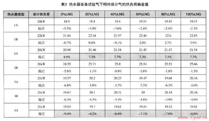 比較各型號熱水器在設(shè)計(jì)氣下的熱負(fù)荷,得出在氣源從100%管輸氣變化到100%LNG時每種熱水器的熱負(fù)荷偏差值。表巾熱負(fù)荷偏差較大者用棕色底紋標(biāo)識出??芍獰崴?-A與4-A在氣源變化時會發(fā)生比較明顯的響應(yīng),可能導(dǎo)致用戶處的不滿。