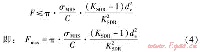 規(guī)程的公式過于簡單,公式表示Fmax僅與PE管材的公稱外徑de及標(biāo)準(zhǔn)尺寸比KSDR有關(guān)。修正后的公式相對復(fù)雜,增加了σMRS和C兩個變量,這就克服了規(guī)程公式的不足之處,可以充分體現(xiàn)PE管道性能及總體設(shè)計系數(shù)的差異性。