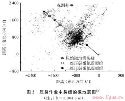 為了增加裂縫和氣層的接觸面積以提高氣井的初始產(chǎn)氣量和采收率,目前一般采用10~20級(jí)的壓裂以增加裂縫的連通。通過井場(chǎng)實(shí)時(shí)微地震來(lái)進(jìn)行監(jiān)控(圖2),可以確定井眼東西和南北方向的裂縫頂端的方位,并且隨著壓裂作業(yè)的進(jìn)行而跟蹤裂縫的形成過程。裂縫垂向的延伸具有特別重要的作用,作業(yè)者需要特別關(guān)注確保裂縫沒有延伸到頁(yè)巖層之外或者鄰近的水層中去,不然會(huì)使頁(yè)巖氣井的經(jīng)濟(jì)效益減少。