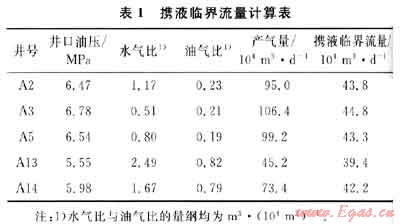 根據(jù)修正后的臨界攜液流量計(jì)算公式系數(shù)C,分析A2、A3、A5、A13井和A14井目前生產(chǎn)狀況下的攜液臨界流量(表1)。
