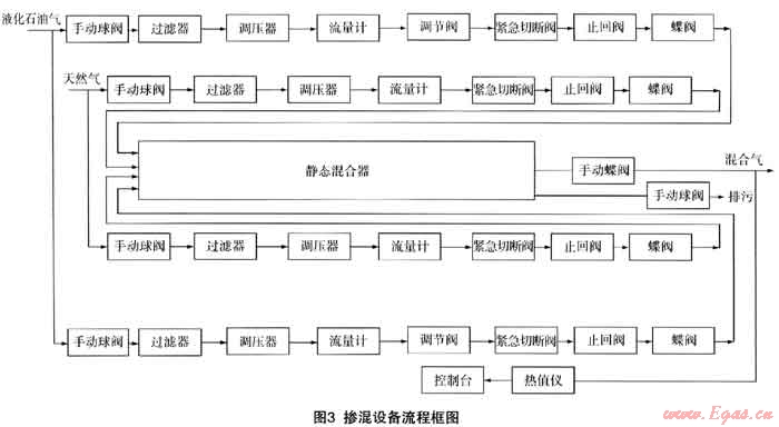 混合天然氣和LPG分別經(jīng)計(jì)量調(diào)壓后同時(shí)進(jìn)入混合器,混合器中設(shè)置了折流板和旋轉(zhuǎn)板,兩種氣體在混合器中經(jīng)過多次折返、旋轉(zhuǎn)流動(dòng),最后達(dá)到95%以上的混合效率。調(diào)節(jié)系統(tǒng)主要由一臺(tái)設(shè)在LPG回路的氣動(dòng)薄膜調(diào)節(jié)閥和相關(guān)控制部件組成,由控制系統(tǒng)根據(jù)天然氣的流量或混合氣的熱值自動(dòng)控制調(diào)節(jié)閥的開度,從而實(shí)現(xiàn)對(duì)LPG進(jìn)入混合器流量的調(diào)控,達(dá)到設(shè)定的華白指數(shù)。
