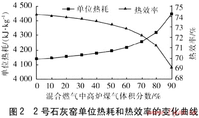 ① 混合燃?xì)獾慕M成影響石灰窯熱效率和單位熱耗,石灰窯的熱工計(jì)算表明,混合燃?xì)庵懈郀t煤氣體積分?jǐn)?shù)從0上升到90%時(shí),石灰窯的熱效率由74.18%降低到69.10%,而石灰窯的單位熱耗從4139kJ/kg升高到4444kJ/kg。
