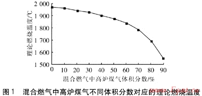 對(duì)于混合燃?xì)庵懈郀t煤氣體積分?jǐn)?shù)從0~90%的變化,高爐煤氣不同體積分?jǐn)?shù)對(duì)應(yīng)的混合燃?xì)饫碚撊紵郎囟纫妶D1。