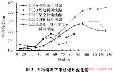 從圖3可知:與架空管道相比,埋地管道泄漏爆炸范圍大且影響時間長。埋地管道爆炸范圍呈指數增加,當達到一定高度后不再升高,濃度隨擴散而減低至爆炸下限外。而架空管道爆炸范圍在85s前增加,且高度比埋地要高,而在85s后降低。這是由于埋地敷設管道泄漏后,氣體速度經過土壤孔隙阻力、慣性阻力的作用,降低較快,甲烷爆炸范圍的起點較小,在一定時間內其爆炸范圍比架空要?。浑S著泄漏的持續(xù),甲烷向周圍環(huán)境緩慢擴散,由于受風力影響較小,在85s后其高度均比架空要高??紫抖仍酱笃溆绊懛秶叫 ?/span>