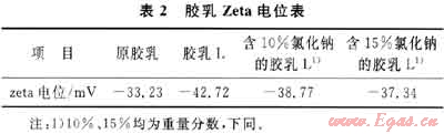 從表2可以看出,耐鹽膠乳和含穩(wěn)定劑的膠乳L的zeta電位分別為-33.23mV和-42.72mV,由此可見穩(wěn)定劑的加入,有利于提高膠乳的穩(wěn)定性。含10%的氯化鈉和含15%氯化鈉的膠乳L的zeta電位分別為-38.77mV和-37.34mV,由于NaCl的加入,使得鈉離子向擴散層擴散,降低了乳液的zeta電位,即降低了膠乳的穩(wěn)定性,即使這樣,由于穩(wěn)定劑的存在,使得含鹽膠乳的zeta電位仍大于不含穩(wěn)定劑的原膠乳的zeta電位,即含鹽膠乳L仍比原膠乳穩(wěn)定。