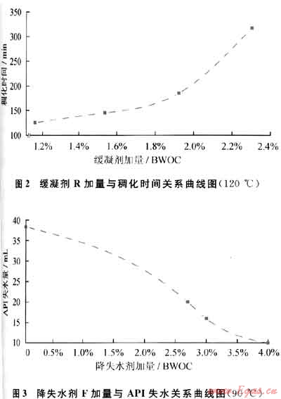由于作為抗衡離子的Na+會擴散到陰離子聚電解質(zhì)分子鏈周圍,屏蔽聚電解質(zhì)自身所帶負(fù)電荷,降低聚合物分子鏈間斥力,導(dǎo)致聚合物分子鏈蜷縮,從而使得普通型外加劑性能變差,因此,必須開發(fā)耐鹽型外加劑。本研究成功開發(fā)了耐鹽型的緩凝劑R和降失水劑F。通過調(diào)整緩凝劑R的加量,水泥漿稠化時間可調(diào),緩凝劑加量在120℃下對稠化時間的影響如圖2所示。水泥漿的API失水隨F加量變化如圖3所示,水泥漿的失水在試驗條件下能控制在50mL以內(nèi)。