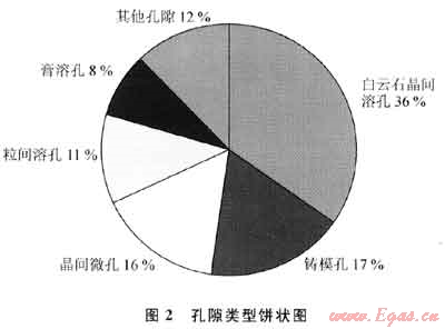 根據(jù)巖心鑄體薄片、電鏡掃描分析,Asmari組孔隙類型豐富多樣,以次生孔隙為主;原生孔隙極少,在成巖作用過程中幾乎破壞殆盡??紫吨饕獮橥砥谌芪g作用形成的白云石晶間溶孔、粒屑鑄模孔、粒間及粒內(nèi)溶孔、膏溶孔或膏???。其中,白云石晶間溶孔,生屑、砂屑等碳酸鹽巖粒屑被溶蝕或選擇性溶蝕形成的鑄模孔、粒內(nèi)或粒間溶孔以及膏溶孔等,分別占各類孔隙的36%;白云石、少量方解石的晶間微孔占16%;粒間孔、粒內(nèi)孔、生屑體腔孔、殼壁孔等原生孔隙以及其他類型的孔隙僅占12%(圖2)。
