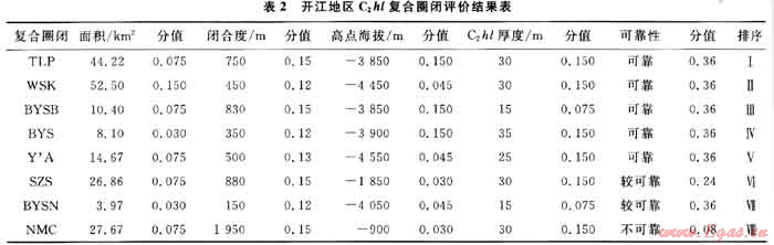 C2hl及其上、下巖層的組合是四川盆地多套生、儲(chǔ)蓋組合中較好的一套組合,經(jīng)過多年的勘探也證實(shí)C2hl具有豐富的天然氣資源。結(jié)合已發(fā)現(xiàn)C2hl氣藏特征對已識別C2hl復(fù)合圈閉面積進(jìn)行劃分,圈閉面積小于10km2的權(quán)值取0.2,圈閉面積大于50km2的取權(quán)值1.0,圈閉面積介于10~50km2的取權(quán)值0.5,圈閉面積評價(jià)系數(shù)權(quán)重為O.15(表1)。