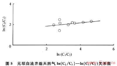 自流井組天然氣ln(C2/C3)值變化很小(處于數(shù)值2附近),在ln(C2/C3)—ln(C1/C2)關(guān)系圖上基本呈一水平直線;而ln(C1/C2)值變化較大(介于2~5)。由此,可以判斷元壩地區(qū)自流井組天然氣主要屬于干酪根裂解氣類型(圖5)。考慮到元壩地區(qū)自流井組天然氣相對(duì)較濕、重?zé)N含量較高的特點(diǎn)及地質(zhì)特征,綜合研究認(rèn)為該區(qū)可能存在少量的原油二次裂解氣。