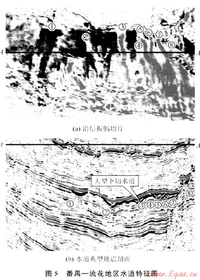 該區(qū)目前無鉆井鉆遇到該地質(zhì)體,但在該區(qū)東部,其水下水道的地震特征非常明顯:利用最新采集的3D地震資料,以精細(xì)的3D地震資料做基礎(chǔ),能夠清晰地觀察到水道的侵蝕、平面分布等特征。通過分析,發(fā)現(xiàn)了8條水道(圖5中①~⑧),自西向東依次排列,由北向南延伸,隨著坡度的逐漸減緩,在河道下方分別演化為扇狀朵體,并相互疊置(圖5-a)。這些水道在不同位置,其形態(tài)、寬度、長度都不同,但具有相似的地震相特征:地震同相軸呈點(diǎn)、段式反射,下切特征明顯,振幅中等-高(圖5-b)。通過這些水道下切形態(tài)、深度、地震反射特征和沉積厚度,可推測(cè)其形成于同一時(shí)期,且物源均來自于正北方向。