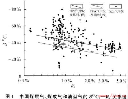 天然氣的甲烷碳同位素值主要受控于原始母質(zhì)類型和后期改造程度,煤層氣與常規(guī)天然氣碳同位素值的差異主要是由于煤層氣具有獨(dú)特的后期改造特征。常規(guī)天然氣甲烷碳同位素值主要受到母質(zhì)和烴源巖熱演化程度(Ro)的影響,相同成熟度條件的烴源巖,煤成氣比油型氣的δ13C1要重,同一母質(zhì)類型的天然氣δ13C1隨著成熟度的增加而變重(圖1);常規(guī)天然氣的后期改造,除典型生物氣外,我國已發(fā)現(xiàn)的大中型煤成氣氣藏受到生物降解的影響較小,對甲烷碳同位素值的影響不大。而煤層氣,由于氣源來自煤巖本身,甲烷碳同位素值除了受烴源巖成熟度影響外,后期的解吸作用、生物作用和水動(dòng)力作用是主要的影響因素。煤層氣為吸附氣,后期吸附解吸過程中,13CH4比12CH4難解吸,從而發(fā)生同位素的分餾效應(yīng),造成同位素值的變化[32];目前工業(yè)開采利用的煤層氣藏一般埋深淺于2000m,生物降解作用使得烴源巖成熟度相近的煤層氣較常規(guī)煤成氣的甲烷碳同位素值偏輕[28,33~34];煤層氣受水動(dòng)力條件影響也較大,其作用機(jī)制為甲烷通過水溶作用而改變同位素的組成[35]。