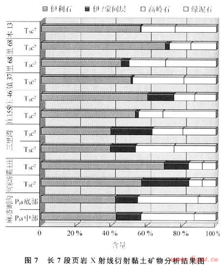 長7段頁巖分布穩(wěn)定,可對比性強。巖心樣品X射線衍射黏土礦物分析結(jié)果顯示:伊利石含量為38.05%~66.10%,伊/蒙間層含量為1.O0%~25.00%,高嶺石含量為5.15%~27.03%,綠泥石含量為7.18%~32.37%(圖7)。巖心及野外露頭觀察表明,長7段頁巖外觀呈黑色,質(zhì)純,偶見介形蟲、魚類化石及星點狀黃鐵礦,并可見到泥包砂等深水沉積構(gòu)造,深湖-半深湖相沉積特征明顯。同時,頁巖段中普遍夾有薄層凝灰?guī)r和砂質(zhì)頁巖,反映了湖盆的輕微震蕩和古氣候環(huán)境的變化。