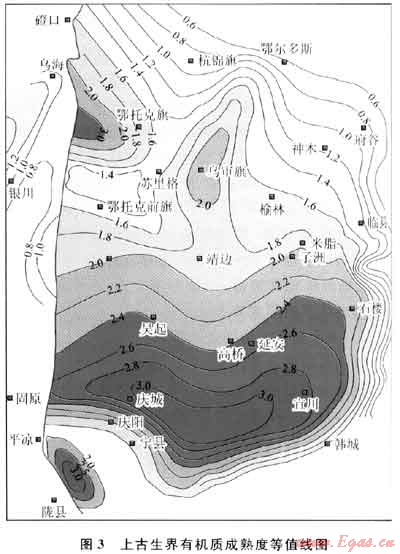鄂爾多斯盆地上古生界地層的Ro集中在1.1%~2.5%,大部分處于高成熟階段,其Ro等值線圖顯示出(圖3),慶城-宜川一帶熱演化程度最高,Ro達到3.0%;烏審旗一帶Ro約為2.0%,鄂托克旗地區(qū)局部Ro最高達3.0%。除東北部杭錦旗 鄂爾多斯-府谷一線以外、東南部大荔向外、西南部固原以西等盆地邊緣地區(qū),上古生界地層絕大部分地區(qū)Ro均超過1.1%,達到了形成頁巖氣藏的成熟度標準。其中榆林地區(qū)Ro介于1.1%~2.5%,處于有利于生成頁巖氣的成熟度范圍內(nèi)。