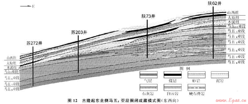 構(gòu)造翻轉(zhuǎn)后對靖西地區(qū)奧陶系中、下組合的天然氣成藏產(chǎn)生了2個方面的重要影響:①馬五5區(qū)域巖性相變的致密石灰?guī)r一側(cè)正處于構(gòu)造的上傾方向,從而對其西側(cè)的白云巖儲集體構(gòu)成了有效的巖性遮擋條件(圖12);②由于東側(cè)上傾,使得上古生界煤系烴源巖層與下古生界白云巖儲層在風化殼界面附近由原來的上下接觸關(guān)系變成一定程度的側(cè)向(或左右)甚至“源下儲上”的接觸關(guān)系,從而更有利于烴類氣體在白云巖儲集體中的充注成藏。