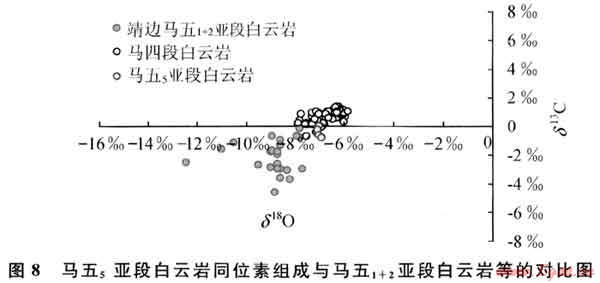 5) 大氣淡水與“富鎂鹵水”混合的白云巖化模式:由于大氣淡水的參與,在古隆起東側(cè)地區(qū)的馬五5沉積層中形成大氣淡水與“富鎂鹵水”的混合水帶,這種成巖介質(zhì)環(huán)境對馬五5的白云巖化作用也會產(chǎn)生顯著的影響,主要表現(xiàn)在2個方面:①稀釋了“富鎂鹵水”,使成巖流體濃度降低,進而減少白云石結(jié)晶時的結(jié)晶中心形成總數(shù)(晶核形成數(shù)),這會使白云石生長更趨緩慢,結(jié)晶更趨自形、粗大;②使先成白云石重結(jié)晶。據(jù)Clyde Moore的研究認為[13],大氣淡水的參與會使先成白云石重結(jié)晶,并使其地球化學特征發(fā)生重組,這也會導致其晶體結(jié)構(gòu)變粗和白云石自形程度的提高。對盆地古隆起東側(cè)馬五5白云巖的地球化學分析結(jié)果表明:馬五5白云巖有序度一般為0.85~0.95,尤其是其C—0同位素特征(δ13C:-0.79‰~0.07‰;δ18O:-7.1‰~-6.9‰),的確與馬五1+2蒸發(fā)潮坪形成的泥粉晶白云巖存在較大的差異(圖8)。
