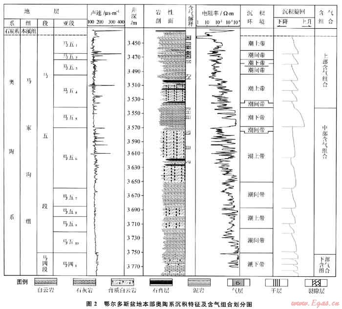 近期勘探研究者將盆地本部的奧陶系劃分為3個含氣組合(圖2):馬五1-馬五4為上部含氣組合(簡稱上組合),儲層主要為風化殼溶孔儲層,圈閉類型以古地貌型地層圈閉為主;馬五5-馬五10為中部含氣組合(簡稱中組合),儲層主要為白云巖晶間孔儲層,圈閉類型以巖性圈閉為主;馬四段及其以下為下部含氣組合(簡稱下組合),儲層主要為白云巖晶間孔儲層,圈閉條件與中組合相近似。