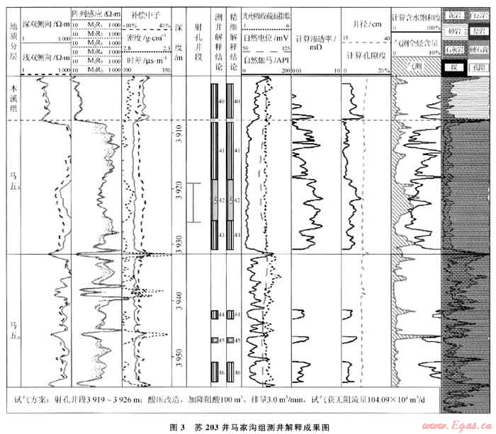 在上述認識的指導下,2009—2010年在蘇里格地區(qū)上古生界砂巖氣藏的勘探中,繼續(xù)堅持兼探下古生界,圍繞古隆起東側(cè)的中組合領(lǐng)域終于在蘇203井和蘇322井的鉆探中取得了重大的突破:蘇203井在馬五5鉆遇較好的白云巖晶間孔儲層,含氣顯示良好,測井解釋氣層厚度為7.4m,試氣獲得104.0882×104m3/d的高產(chǎn)氣流(圖3);蘇322井馬五6鉆遇白云巖儲層,測井解釋氣層厚度為3.8m,試氣獲得41.5904×104m3/d的高產(chǎn)氣流。隨后的研究證實,馬五5含氣層段為白云巖晶間孔型儲層,明顯不同于靖邊地區(qū)馬五1+2的風化殼溶孔型儲層,圈閉成藏特征也與靖邊地區(qū)的風化殼氣藏存在較大差異,從而展開了對古隆起東側(cè)地區(qū)中組合沉積及成藏規(guī)律的綜合研究,形成了古隆起東側(cè)地區(qū)中組合存在區(qū)域性巖性圈閉成藏有利區(qū)帶的新認識,奠定了中組合規(guī)??碧桨l(fā)現(xiàn)的基礎(chǔ)。近期鉆探的蘇345井在馬五5試氣又獲得225.44×104m3/d的高產(chǎn)工業(yè)氣流,目前已落實烏審召、烏審旗、安邊、吳起4個中組合成藏含氣富集區(qū),初步估算天然氣儲量規(guī)模超過1000×108m3。