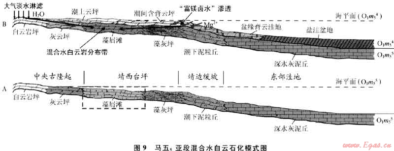 4) 大氣淡水的參與:在馬五5沉積后進入馬五4沉積期時,古隆起地區(qū)大部分時間處于間歇暴露的沉積環(huán)境,當發(fā)生大氣降水時,大面積的降水會在陸地上匯聚后向古隆起兩側(cè)地區(qū)下滲分散,當其進入古隆起東側(cè)先期沉積的馬五5沉積層中時,也會對馬五5沉積起到一定的改造作用。淡水作用的直接效果是會導致碳酸鹽沉積物(尤其是文石及方解石等CaC03礦物)的部分溶解,其所產(chǎn)生的Ca2+離子也會對鄰近沉積區(qū)石膏的沉淀起到一定的促進作用,從而進一步推動上述“石膏沉淀-白云石化交代”的地球化學循環(huán)過程。