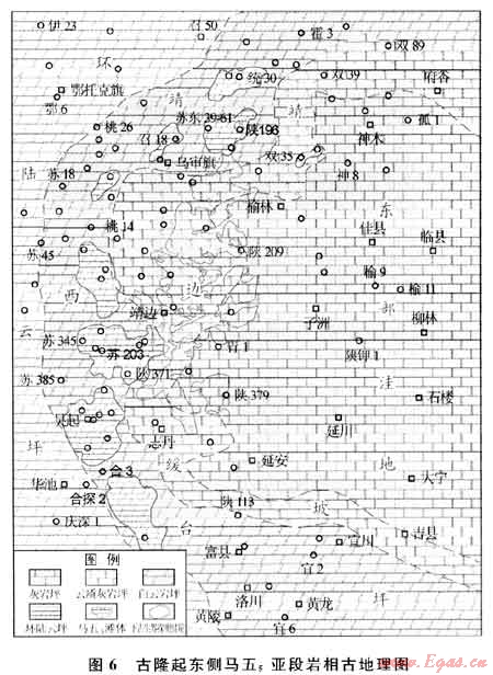 靖邊氣田是發(fā)育在盆地中部奧陶系馬家溝組碳酸鹽巖古風化殼頂部的古地貌圈閉(地層圈閉的一種特殊形式),其主力儲層是馬五1+2風化殼溶孔型儲層,儲層孔隙發(fā)育受含膏云坪沉積相帶及巖溶古地貌的控制極為明顯,圈閉類型主要為巖溶古地貌圈閉[3~7]。該氣田被發(fā)現(xiàn)后,經(jīng)歷了20世紀90年代的快速探明和高效開發(fā)階段,很快躋身我國陸上最大的整裝碳酸鹽巖氣田。進入21世紀以來、圍繞靖邊氣田周邊地區(qū)的天然氣勘探及地質(zhì)研究工作不斷持續(xù)和深入,在該氣田的東側(cè)及西部都相繼取得了較大的研究和勘探進展,探明儲量較20世紀幾近翻番。截至目前,已在盆地中部下古生界探明天然氣地質(zhì)儲量逾4000×108m3,開發(fā)建成50×108m3的年生產(chǎn)能力,成為向北京、天津及其周邊大中城市供氣的主力氣源。隨著21世紀以來盆地上古生界致密砂巖氣藏勘探的逐步深入,盆地下古生界碳酸鹽巖天然氣勘探能否取得新的更大的突破,成為近期勘探家們亟待回答的問題。