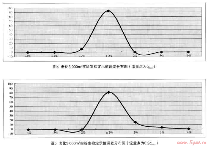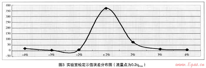對于0.2qmax流量點,實驗室檢定示值誤差在±2%以內的為370臺,比例72.5%,示值誤差在±3%以內的為453臺,比例88.8%,±4%以內的為473臺,比例92.7%.如果按照±4%為合格區(qū)間,則現(xiàn)場檢定的儀表合格率可達92.7%,與大流量點檢定合格率比較接近,說明90%以上的儀表是合格的.可以繼續(xù)使用。圖3所示的曲線是一個典型的正態(tài)分布,其數(shù)值的絕大部分(約93%)都在合格區(qū)間內。