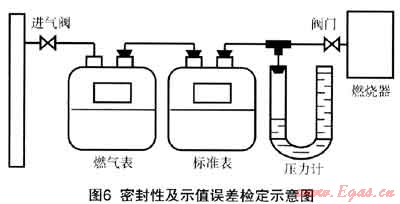 燃氣表出口或燃氣表后其它管道位置連接壓力計,如圖6所示。打開進氣閥,燃氣壓力經燃氣表與壓力計達到平衡,壓力計顯示燃氣工作壓力。關閉進氣閥,保持3min,氣路系統(tǒng)應不漏氣。