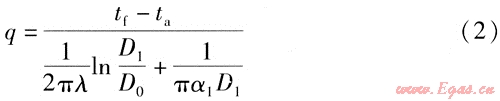 忽略管道的導(dǎo)熱熱阻、燃?xì)馀c管道內(nèi)表面對流換熱的熱阻,得到公式(2)[4]。
