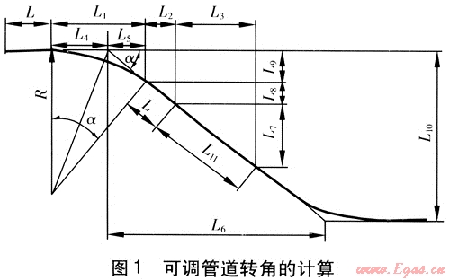 可調(diào)管道轉(zhuǎn)角的計算見圖1。