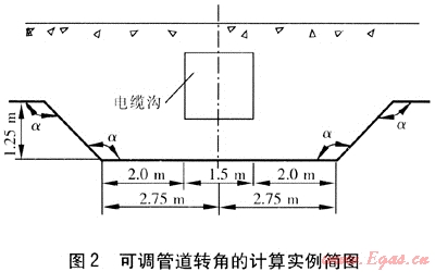 下面舉一個工程實例。在燃氣管道的縱斷圖設(shè)計中遇到一處電纜溝,采用可調(diào)管道轉(zhuǎn)角的計算方法進行計算,可調(diào)管道轉(zhuǎn)角的計算實例簡圖見圖2。