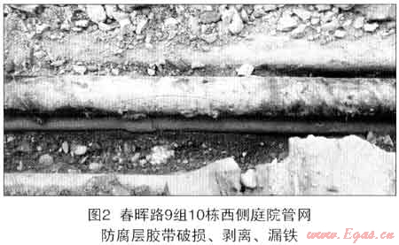 按照SY/T0087—95《鋼質(zhì)管道及儲(chǔ)罐腐蝕與防護(hù)調(diào)查方法標(biāo)準(zhǔn)》,破損缺陷≥8處/1Okm鋼質(zhì)管網(wǎng)評(píng)級(jí)為“差”。在公司長(zhǎng)達(dá)130km埋地鋼質(zhì)管網(wǎng)中,共檢出防腐層破損缺陷303處,超過(guò)23處/km,顯然管道防腐層屬“差”的等級(jí)。開(kāi)挖發(fā)現(xiàn)防腐層缺陷包括以下幾種形態(tài):(1)施工時(shí)未防腐;(2)施工時(shí)創(chuàng)傷(包括點(diǎn)狀和帶狀),此種情形占據(jù)了大部分,觸目驚心(見(jiàn)圖2);(3)防腐層經(jīng)長(zhǎng)時(shí)間浸水起泡;(4)管線彎又、三通、四通等部位防腐施工質(zhì)量差;(5)入戶(hù)管線出土處腐蝕較普遍。防腐層缺陷處管道本體腐蝕包括點(diǎn)狀腐蝕和面狀腐蝕,其中以點(diǎn)狀腐蝕危害為重,嚴(yán)重處已穿孔漏氣。