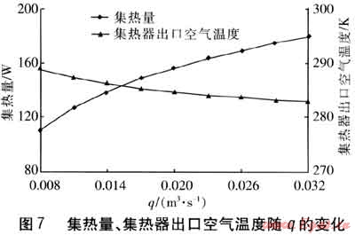 保持其他參數(shù)不變,集熱量、集熱器出口空氣溫度隨q的變化見圖7。由圖7可知,隨著q的增大,集熱器出口空氣溫度降低,這是由于q的增大易導(dǎo)致空氣穿過吸熱板的時間和在集熱器內(nèi)部流動的時間縮短,影響了換熱效果。然而,集熱量一方面取決于集熱器出口空氣溫度與環(huán)境溫度之差,另一方面取決于q。由圖7可知,當(dāng)q增大時,集熱器出口空氣溫度降低幅度較小,此時q成為影響集熱量的決定因素。因此隨q的增大,集熱量逐漸升高。但在集熱器出口空氣溫度逐漸減小的影響下,集熱量的增長速率是逐漸減緩的。