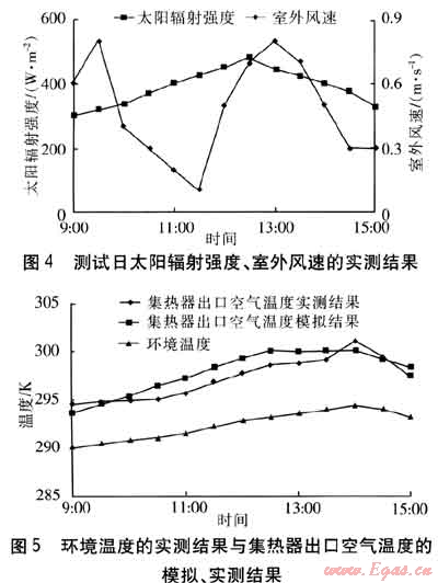 選取2009年10月初天氣晴好的一天作為測試日,測試時間為9:00—15:00。測試日太陽輻射強(qiáng)度、室外風(fēng)速的實(shí)測結(jié)果見圖4。環(huán)境溫度的實(shí)測結(jié)果與集熱器出口空氣溫度的模擬、實(shí)測結(jié)果見圖5。