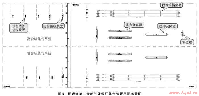 本著緊湊、美觀、安全及有利于操作、檢修的原則,阿姆河第二天然氣處理廠的集氣裝置在設(shè)備平面布置方面較第一天然氣處理廠集氣裝置作了很大改進,高、低含硫集氣系統(tǒng)成兩列對稱布置,同類設(shè)備相對集中,管架長度短,裝置區(qū)整齊、美觀,預(yù)留操作空間。阿姆河第二天然氣處理廠集氣裝置平面布置情況如圖6所示。