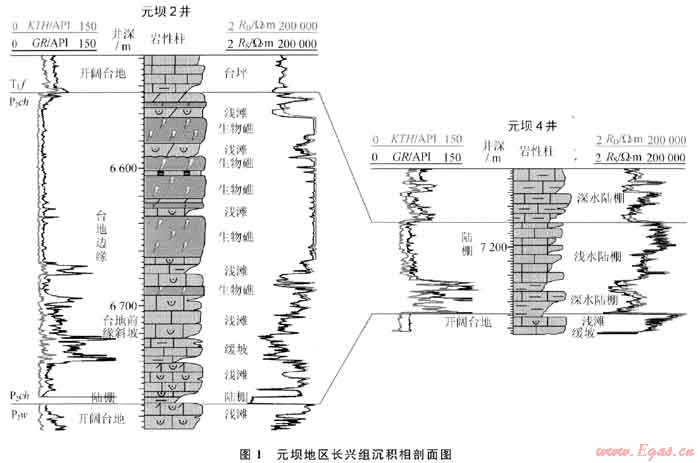 如元壩2井、元壩101井、元壩102井均在長興組頂部發(fā)育了一套局限渴湖沉積環(huán)境中的同生期混合水白云巖,其下部地層溶蝕作用較強(qiáng),溶蝕孔隙發(fā)育,測井解釋的孔隙度為4%~12%(圖4),形成了一套較好的儲層,測試獲得高產(chǎn)天然氣硫。而元壩4井,由于在長興組頂部未發(fā)育該套白云巖,其下部溶蝕作用弱,溶蝕孔隙不發(fā)育,測井解釋的孔隙度小于2%(圖4),未鉆遇儲層。
