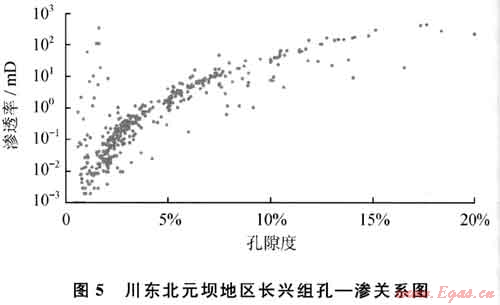 圖5表明,除局部滲透率受裂縫影響高于正常值外,總體上隨著孔隙度的增加,滲透率也隨之增大,儲(chǔ)層孔-滲相關(guān)性較好,元壩地區(qū)長興組以孔隙型儲(chǔ)層為主,發(fā)育部分裂縫-孔隙型儲(chǔ)層,屬于中低孔隙度、中低滲透率儲(chǔ)層。