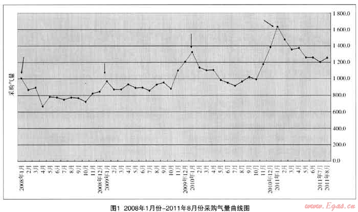 表1 2008年1月至2011年8月天然氣采購(gòu)氣量表 單位:萬(wàn)m3