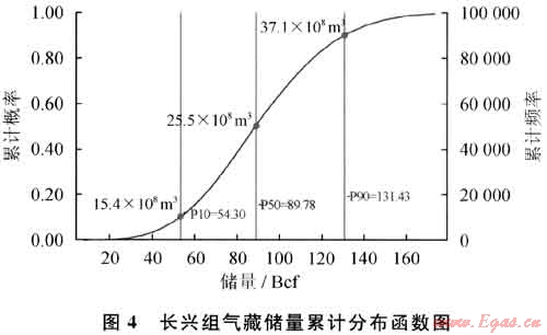 一旦確定代理方程,可以應用蒙特卡洛模擬產生地質儲量分布。對方程中的每個項,確定其分布函數。通常來說,儲層頂部深度、孔隙度、孔隙度下限值、氣水界面為三角分布,相變界限為均勻分布[2]。圖4為最終得到七里北長興組氣藏天然氣地質儲量:P10=15.4×108m3;P50=25.5×108m3;P90=37.1×108m3。